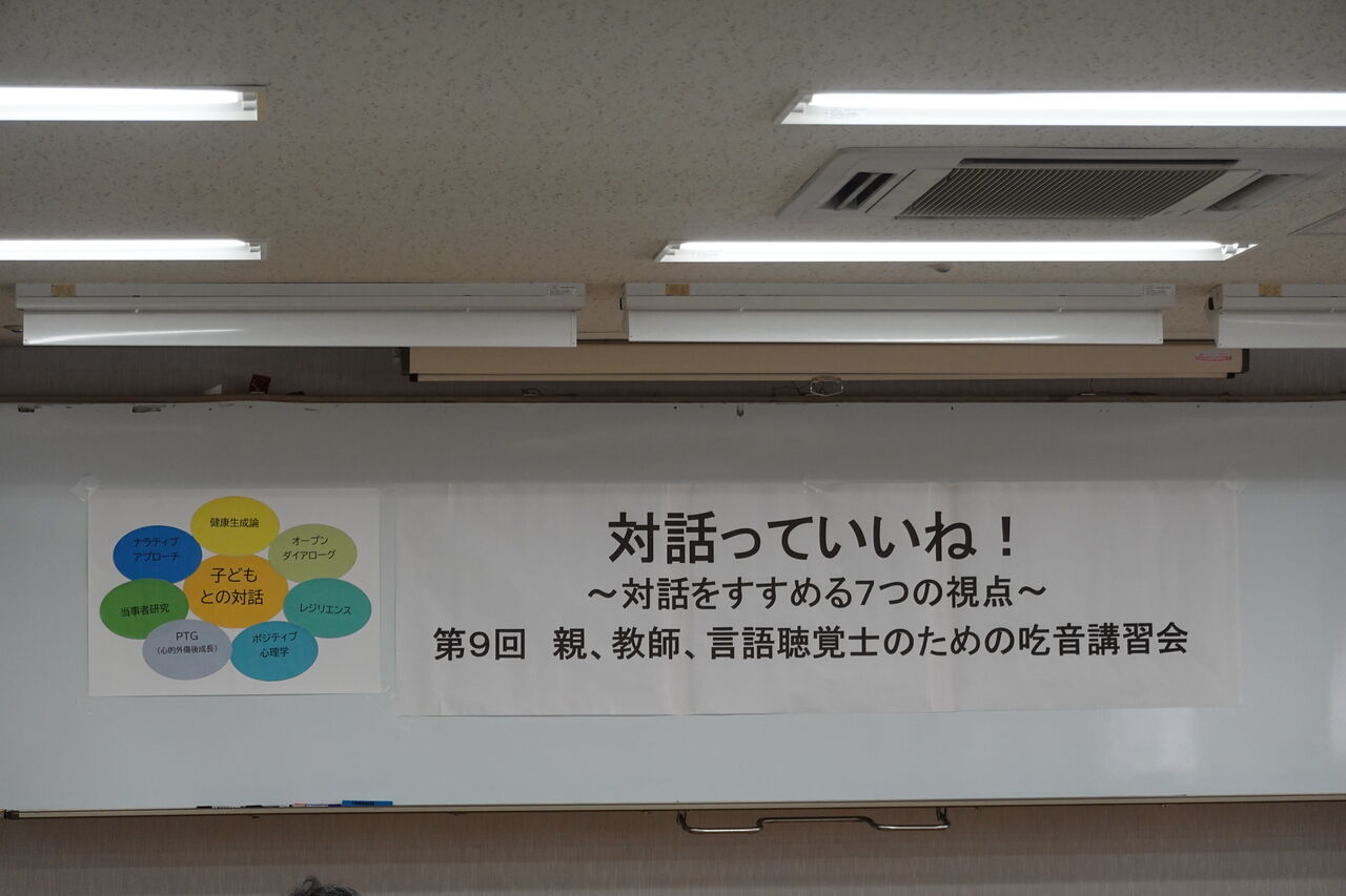 さて、2日目。まず、この吃音講習会の顧問である、国立特別支援教育総合研究所の上席総括研究員であり、研究企画部長である牧野泰美さんの「対話とは何か」の基調提案から始まりました。牧野さんの存在は、僕たちにとってとても大きいです。安心感を与えてくれます。牧野さんは、全国各地のことばの教室とつながりをもち、あちこち動いておられますが、この講習会は、そんな研修会と違ってゆったりと参加できる、国立特別支援教育総合研究所という名前が教育委員会などで役に立つかもしれないと、みんなを笑わせながら、話し始めました。自分の緘黙の体験をベースに、子どもとの関係性について、対話の良さについて、話していただきました。